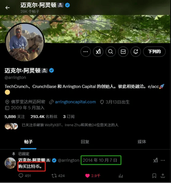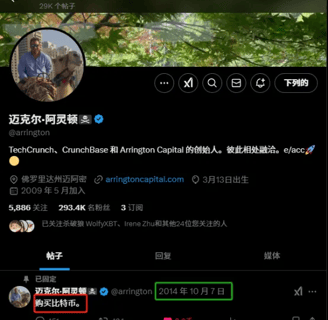 2014년 10 월 7일 Michael Arrington 의 Twitter 에 고정된 트윗으로 , 비트코인을 구매하겠다고 단호하게 주장함