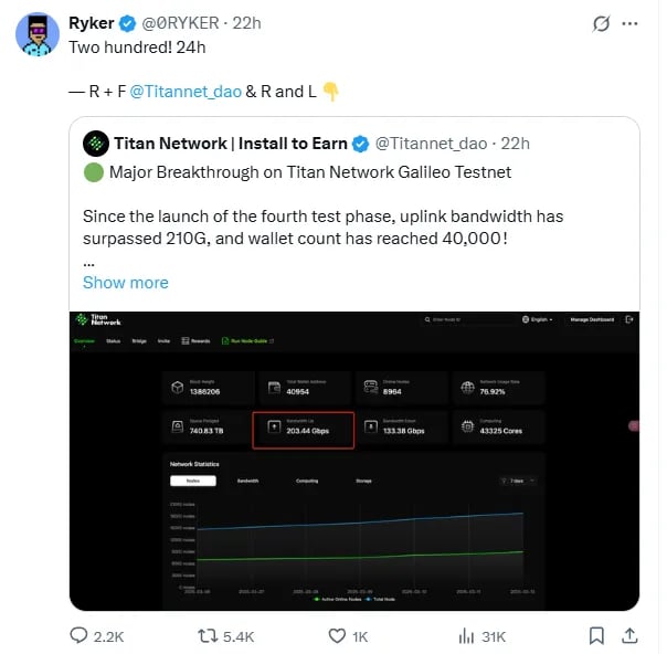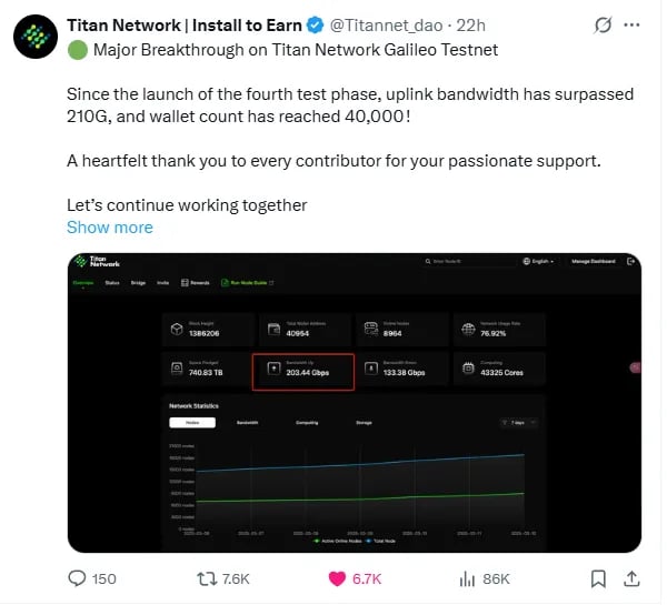 좋은 소식이에요! ! ! Titan Network Galileo Testnet이 주요 돌파구 달성